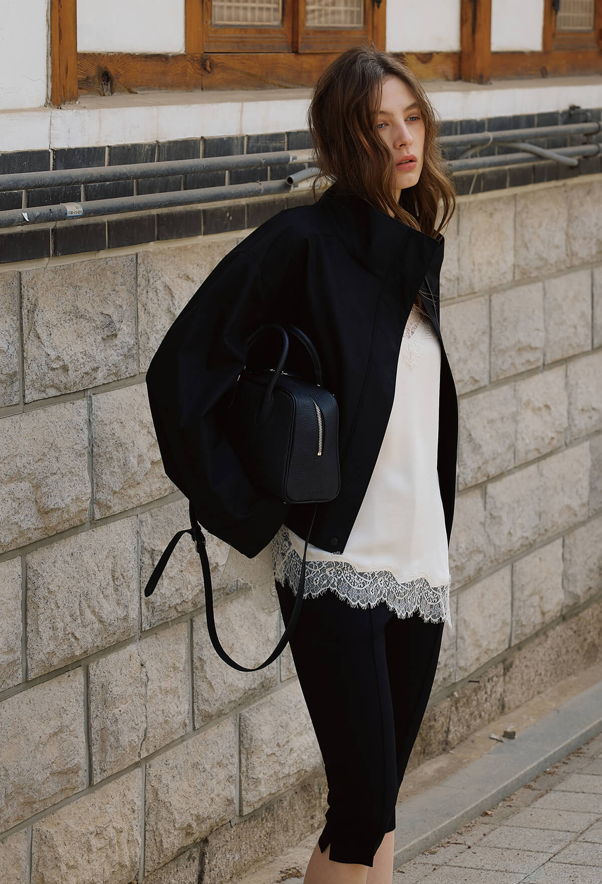 목선을 여유롭게 감싸 답답함 없이 시크한 분위기를 연출하며,