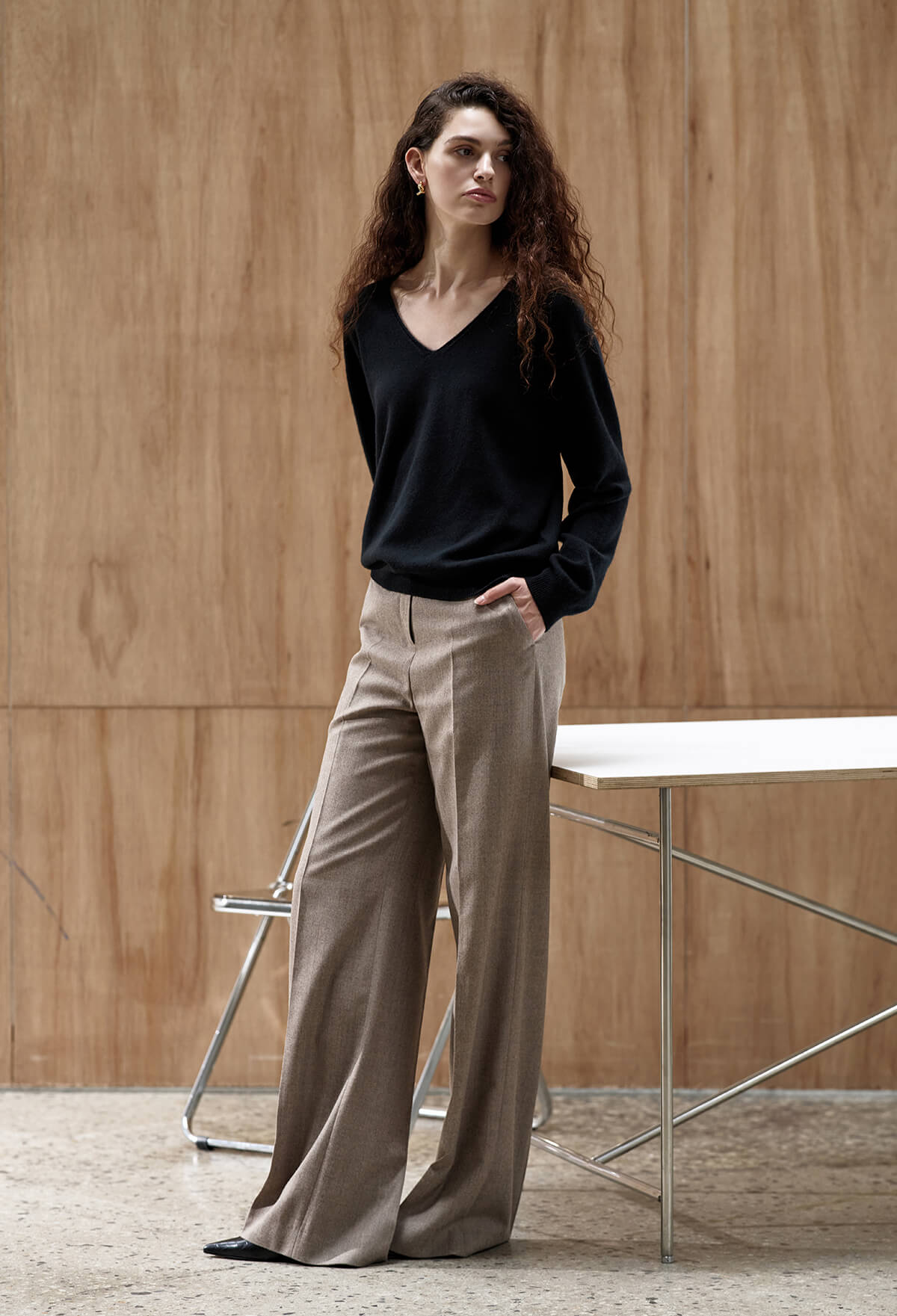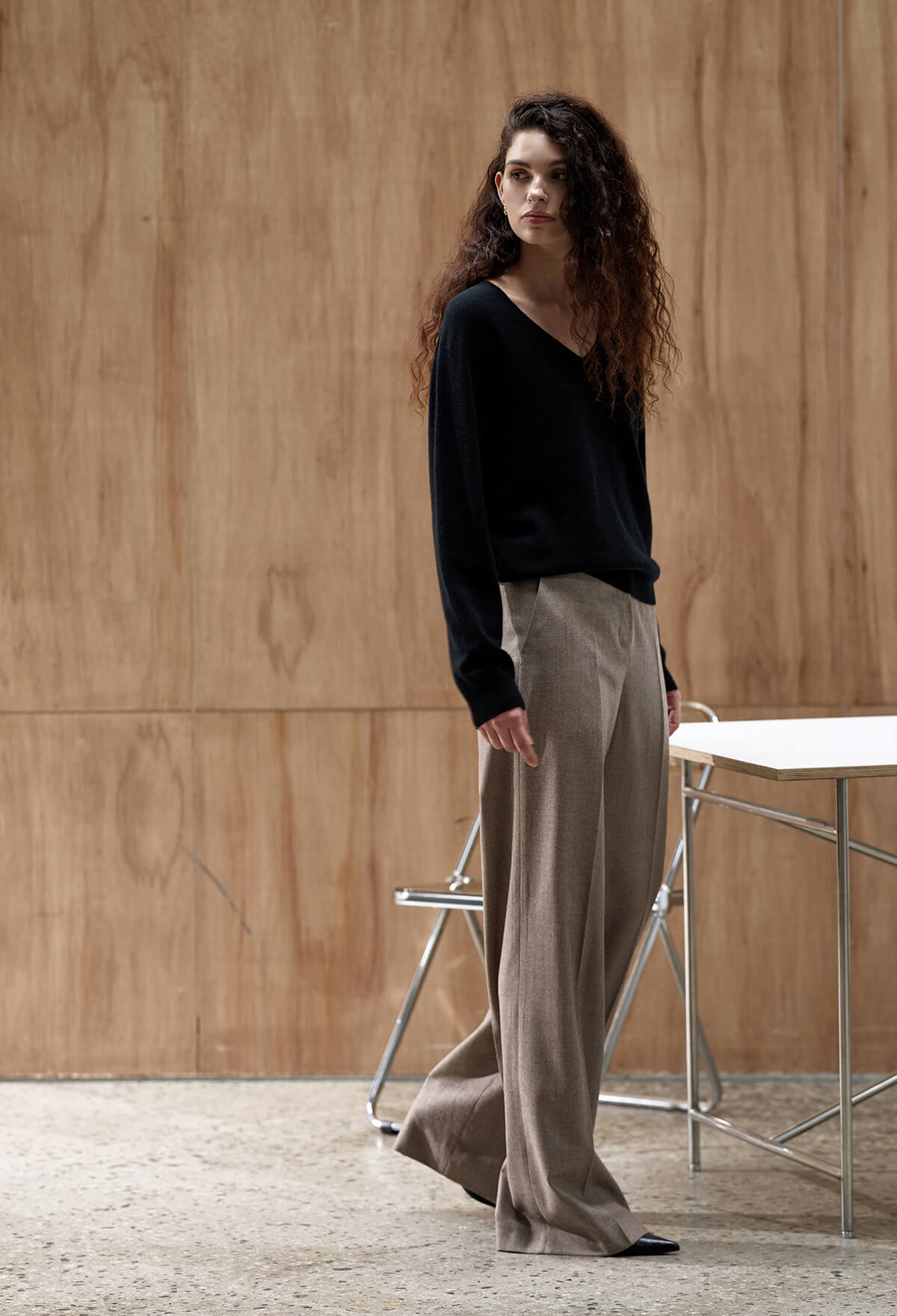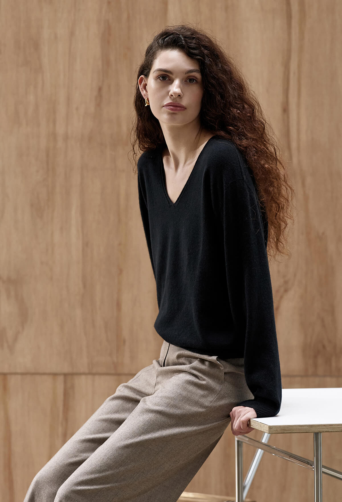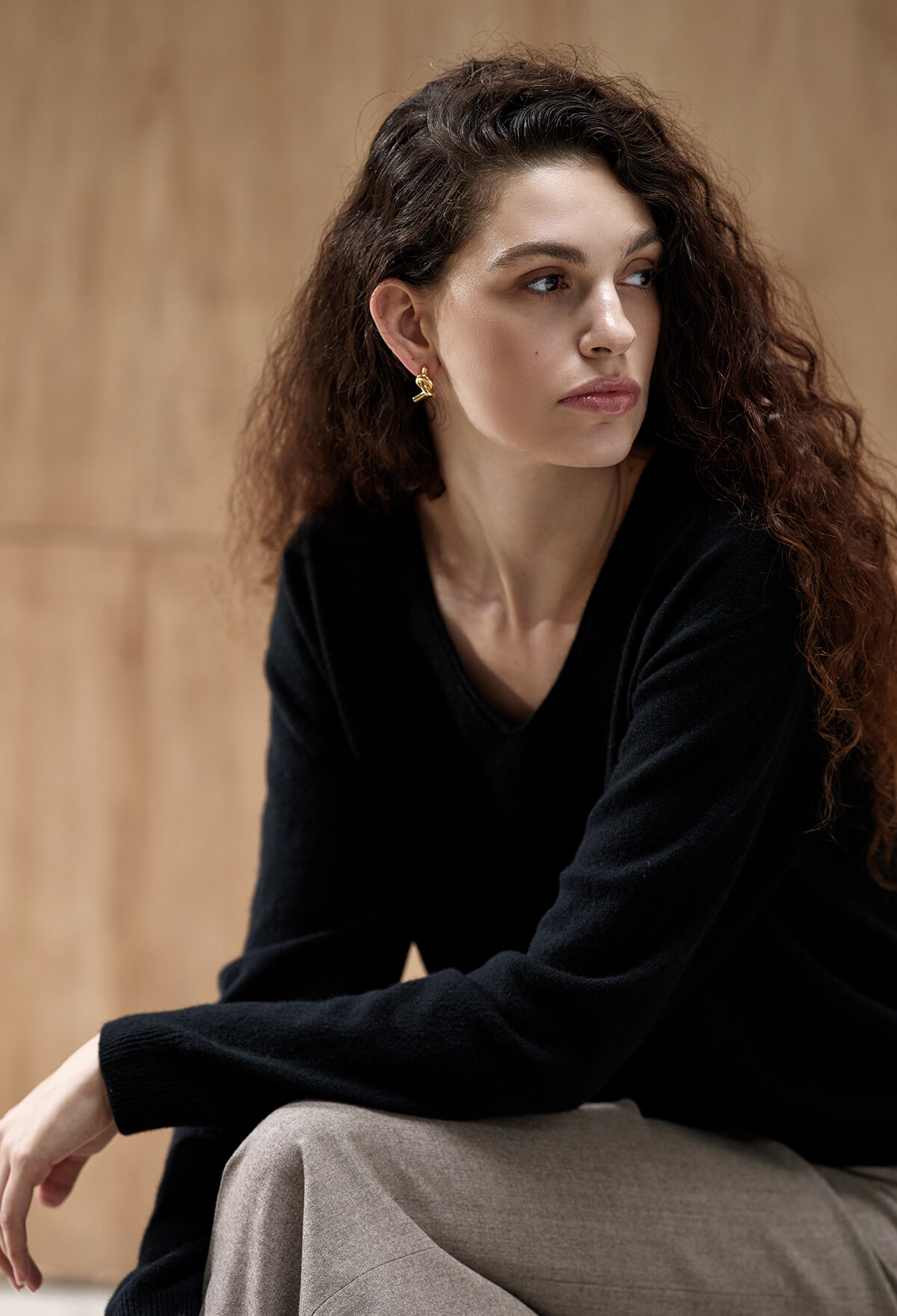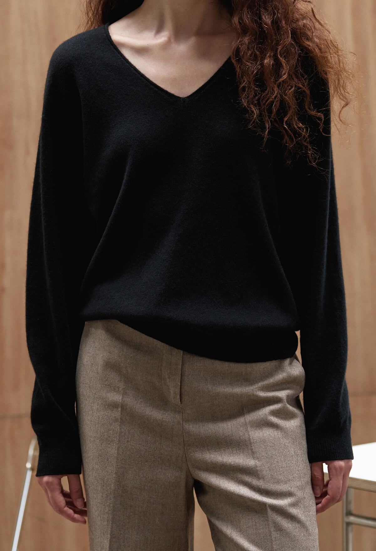 말림단 처리로 볼륨감을 살린 우아한 V넥 라인은