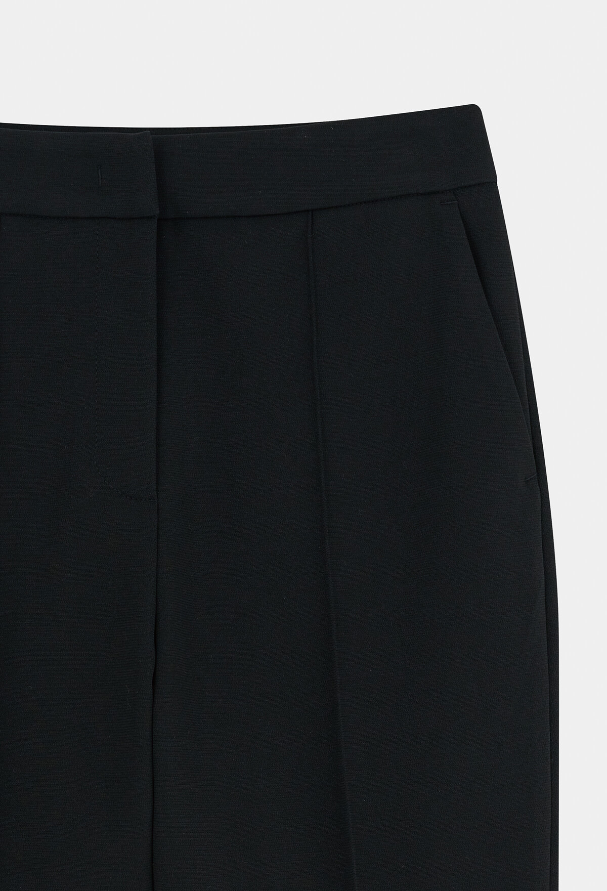다리 라인을 따라 세로로 곧게 뻗은 앞 중심 핀턱 디테일이