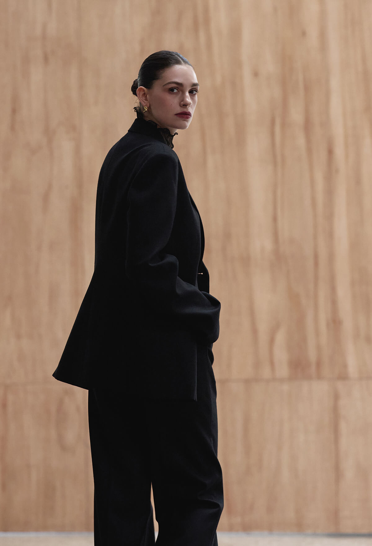 포멀하면서도 품격 있는 무드를 연출하는 아우터입니다.